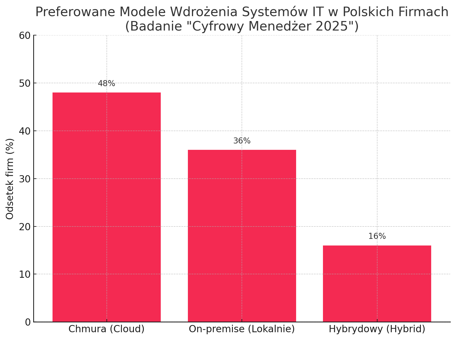 Dodatkowym czynnikiem generującym zapotrzebowanie na rozwiązania IT, w tym backup i storage, jest rosnąca liczba nowych przedsiębiorstw w Polsce, szczególnie w sektorze usług. Polskie firmy coraz częściej dostrzegają korzyści płynące z cyfryzacji i inwestują w nowoczesne technologie. Według danych z raportu “Cyfrowy Menedżer 2025” , aż 48% dostawców systemów IT wskazało chmurę jako najczęściej wybierane rozwiązanie przez ich klientów w 2024 roku. Niemniej jednak, rozwiązania instalowane lokalnie (on-premise) wciąż cieszą się popularnością (36% wskazań), podobnie jak modele hybrydowe, łączące oba podejścia (16%).