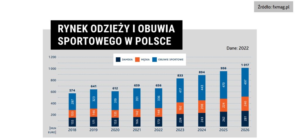 Według analiz, a w najbliższych latach przewidywane jest dynamiczny rozwój w branży sportowej, gdzie największy segment (około połowy rynku) stanowi obuwie.
