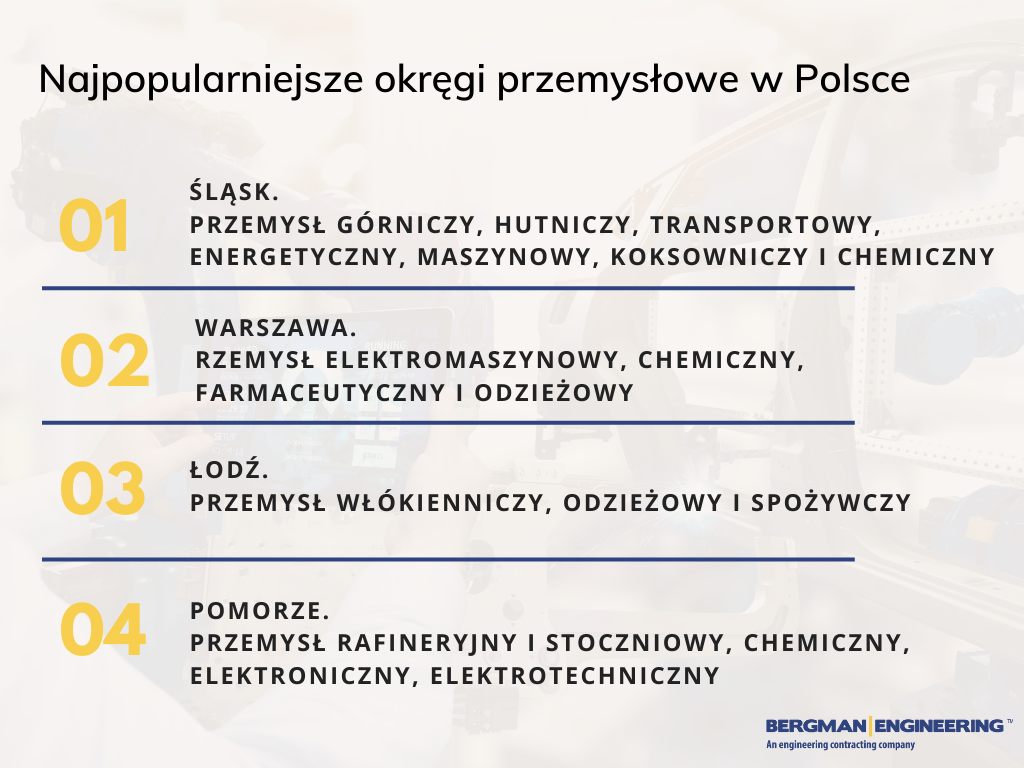 Oczywiście w okręgach przemysłowych. To przede wszystkim południe Polski, szczególne środkowo-wschodnia część województwa śląskiego, ze względu na wysoce rozwinięty przemysł górniczy, hutniczy, transportowy, energetyczny, maszynowy, koksowniczy i chemiczny. Ważne jest także centrum kraju, szczególnie Warszawa i okolice, gdzie mocno rozwija się przemysł elektromaszynowy, chemiczny, farmaceutyczny i odzieżowy. Trzecim kluczowym ośrodkiem jest Łódź (przemysł włókienniczy, odzieżowy i spożywczy), a czwartym – Pomorze (ze względu na przemysł związany z gospodarką morską: rafineryjny i stoczniowy, a poza nimi również chemiczny, elektroniczny, elektrotechniczny).