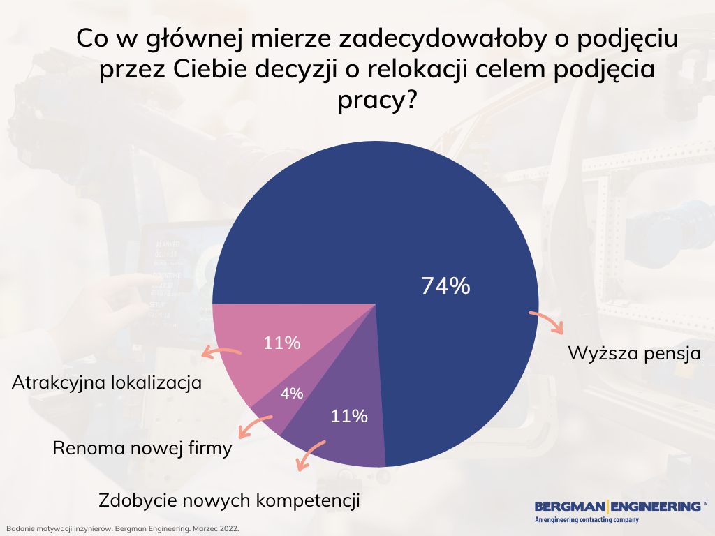 Z „Badania motywacji inżynierów” przeprowadzonego przez Bergman Engineering w marcu 2022 roku na grupie 300 inżynierów wynika, że aż 74% pracowników byłoby skłonnych podjąć decyzję o relokacji do innego miasta, jeżeli otrzymałoby wyższą pensję. 11% ankietowanych zadeklarowało, że zrobiłoby to dla możliwości zdobycia nowych kompetencji, 11% ze względu na atrakcyjną lokalizację, a 4% – dzięki dobrej renomie nowej firmy.