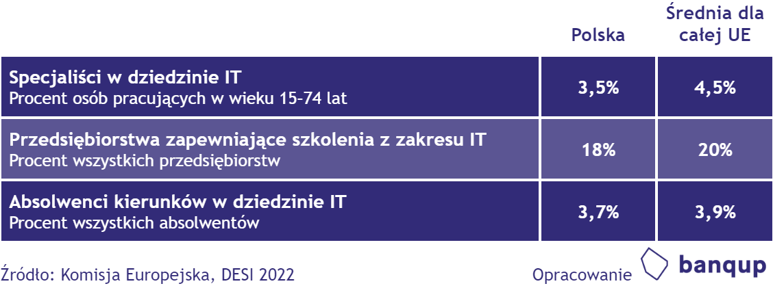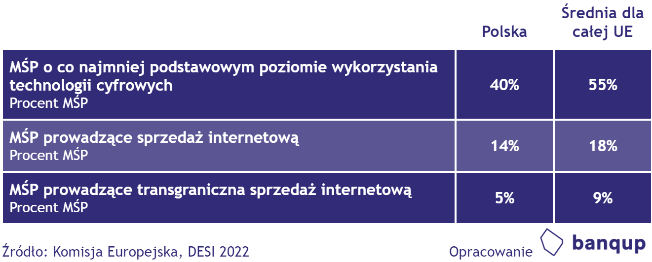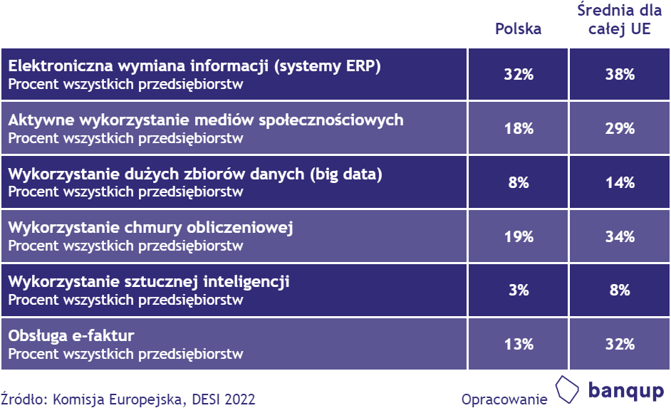 W najnowszym Indeksie gospodarki i społeczeństwa cyfrowego (DESI 2022), przygotowanym przez Komisję Europejską, Polska zajęła podobnie jak rok temu 24 miejsce. Niestety w zakresie cyfryzacji przedsiębiorstw wynik jest gorszy niż rok temu. Szansą na polepszenie tego stanu są środki z Krajowego Planu Odbudowy, z których ponad 21 proc. (ponad 7,5 mld euro) przeznaczone ma być na transformację cyfrową.