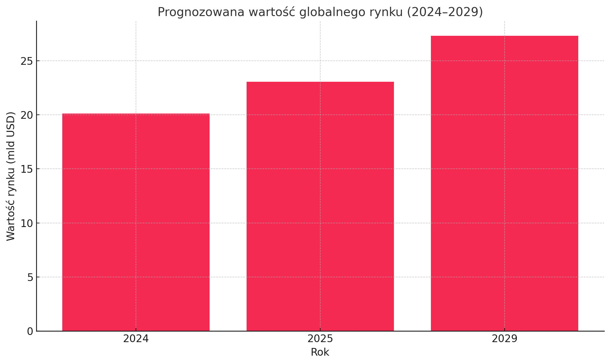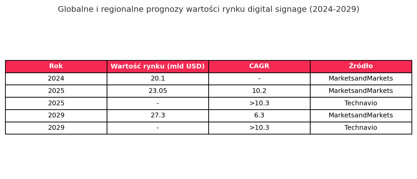 Globalne prognozy wskazują na dalszy, znaczący wzrost wartości rynku digital signage. Szacuje się, że do roku 2029 rynek osiągnie wartość 27,3 miliardów USD, przy średniorocznym tempie wzrostu (CAGR) wynoszącym od 6,3% do ponad 10%. Niektóre bardziej optymistyczne raporty przewidują, że do lat 2029-2034 wartość rynku może wzrosnąć nawet do 34-49,4 miliardów USD.