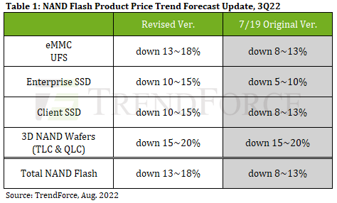 Ponieważ rosnąca presja inflacyjna nadal osłabia gospodarkę światową, popyt na różne aplikacje konsumenckie został obniżony od drugiego kwartału i oczekuje się, że nie poprawi się do końca roku. Chociaż popyt na serwery jest stabilny, rozpoczął się okres dostosowywania zapasów, co pogłębia nadpodaż na rynku pamięci NAND Flash. Zgodnie z badaniami TrendForce, ponieważ sprzedawcy nie są już ograniczeni stałymi cenami, spadki cen pamięci NAND Flash w trzecim kwartale wzrosły z pierwotnych prognoz 8-13% do 13-18% kw/kw. Jeśli planowanie zdolności produkcyjnych producentów nie zostanie ograniczone, spadek ten prawdopodobnie utrzyma się w czwartym kwartale.
