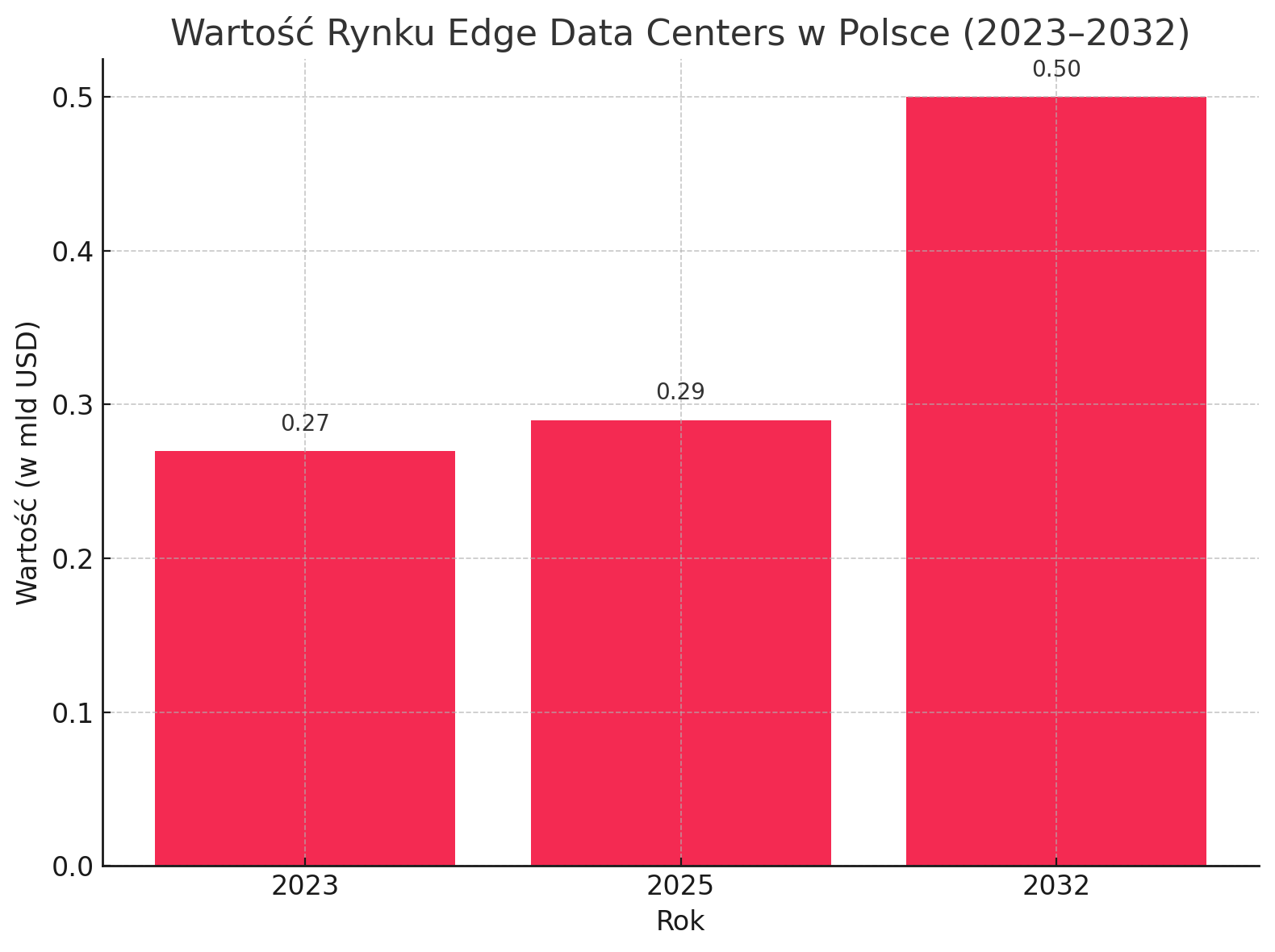 Polski rynek centrów danych był wyceniany na 2,03 miliarda USD w 2023 roku i prognozuje się, że osiągnie 5,16 miliarda USD do 2034 roku, ze złożoną roczną stopą wzrostu (CAGR) wynoszącą 7,84% w latach 2025-2034. Segment Edge Data Centers w Polsce był wyceniany na 0,27 miliarda USD w 2023 roku i ma wzrosnąć do 0,5 miliarda USD do 2032 roku. Wzrost ten jest napędzany rosnącym zapotrzebowaniem na aplikacje o niskich opóźnieniach, krytyczne dla IoT i przetwarzania danych w czasie rzeczywistym. Rynek centrów danych w Polsce jest również mierzony mocą IT (MW), z prognozowanym wzrostem z 441,8 MW w 2025 roku do 713,3 MW w 2030 roku, z CAGR 10,05%.