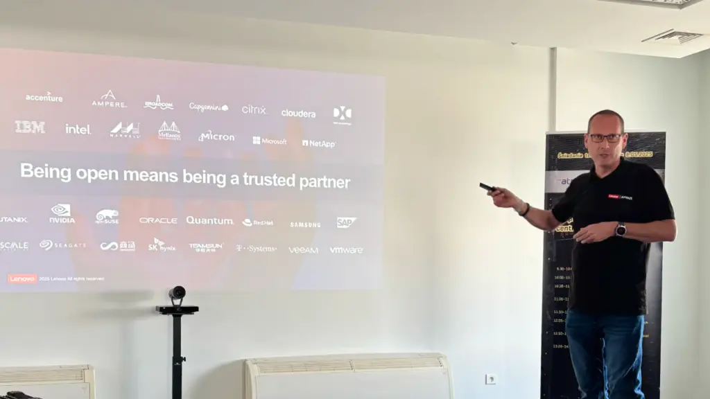 W czasach, gdy jeden serwer potrafi pobierać nawet 10 kilowatów mocy, pytanie o wydajność nieodłącznie łączy się z pytaniem o zużycie energii. Dla Lenovo kluczem okazuje się optymalizacja całego ekosystemu sprzętowego – od projektowania płyty głównej po selekcję dysków NVMe. „To, co wyróżnia Lenovo, to fakt, że korzystamy teoretycznie z tych samych komponentów co inni – ale nasze własne systemy chłodzenia i autorskie projekty płyt głównych pozwalają wyciągnąć z nich znacznie więcej.” – mówił Łukasz Borkowski, Technical Channel Sales w Lenovo.