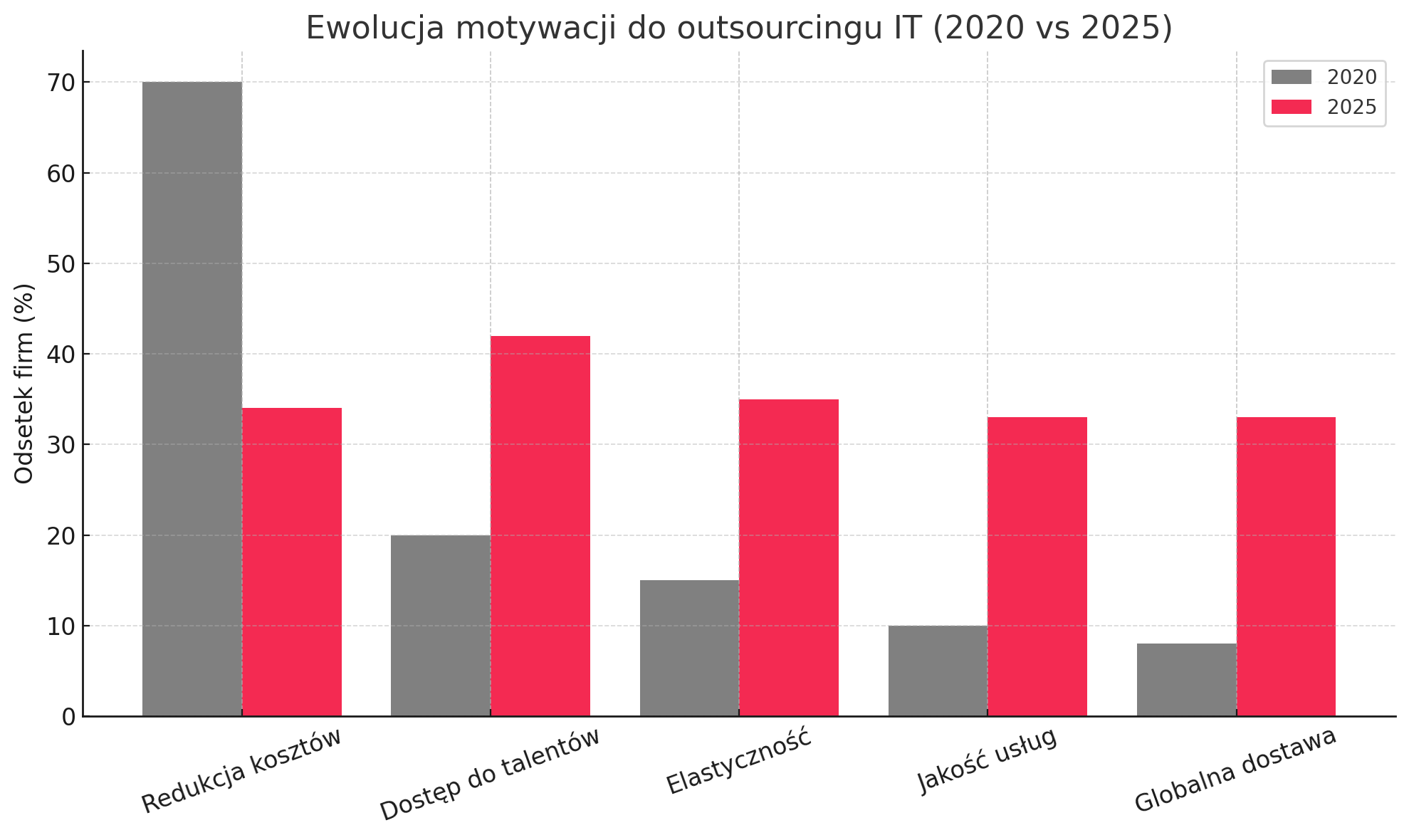 Global trends in IT outsourcing clearly indicate an evolution in companies’ motivations. While cost reduction was the main objective in 2020 (70% of companies), today, while optimising spend remains important (34%), companies increasingly value access to specialist talent (42%), flexibility (35%), high service quality (33%) and global delivery (33%). This shift in priorities signals a strategic transformation in the perception of outsourcing – from a cost-cutting tool to a key partnership to support business growth and innovation.