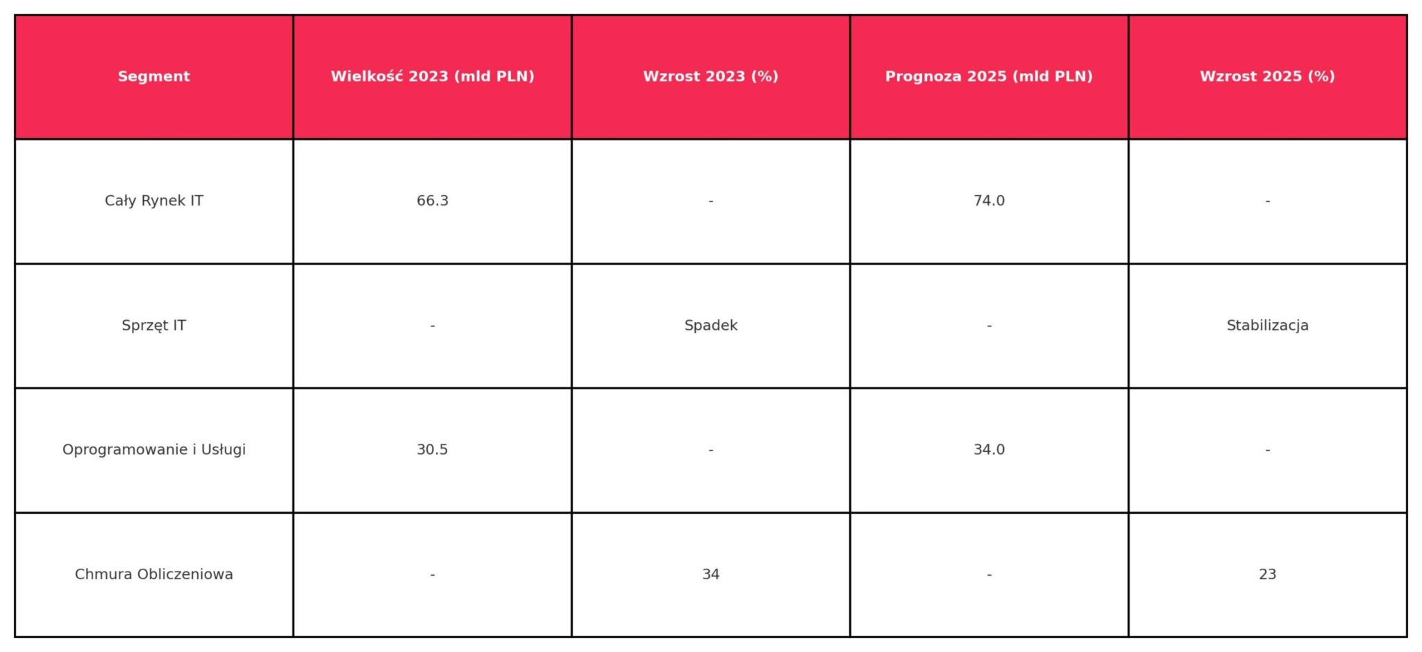 Analiza poszczególnych segmentów rynku IT ujawnia zróżnicowaną dynamikę. Podczas gdy rynek sprzętu IT wykazuje tendencję do spadku i stabilizacji, segment oprogramowania i usług odnotował dynamiczny wzrost o 8,2% w 2023 roku, osiągając wartość 30,5 miliarda PLN. Przewiduje się, że w 2025 roku wartość tego segmentu wzrośnie do 34 miliardów PLN. Firma IDC Poland prognozuje, że sprzedaż oprogramowania będzie rosła najszybciej w 2024 roku (o 14,8%), podczas gdy ogólny wzrost rynku ICT może być wolniejszy (o 1,8%) ze względu na nasycenie rynku sprzętu. Oczekuje się również zdrowego wzrostu w segmencie usług IT. Ta rozbieżność w tempie wzrostu poszczególnych segmentów sugeruje, że strategie sprzedaży powinny koncentrować się na obszarach o wysokim potencjale wzrostu, takich jak oprogramowanie i usługi, w tym outsourcing i usługi integracyjne, na które popyt rośnie ze względu na rosnące płace w branży IT. Nasycenie rynku sprzętu może natomiast wymagać od profesjonalistów sprzedaży skupienia się na modernizacjach, wymianach lub niszowych obszarach.