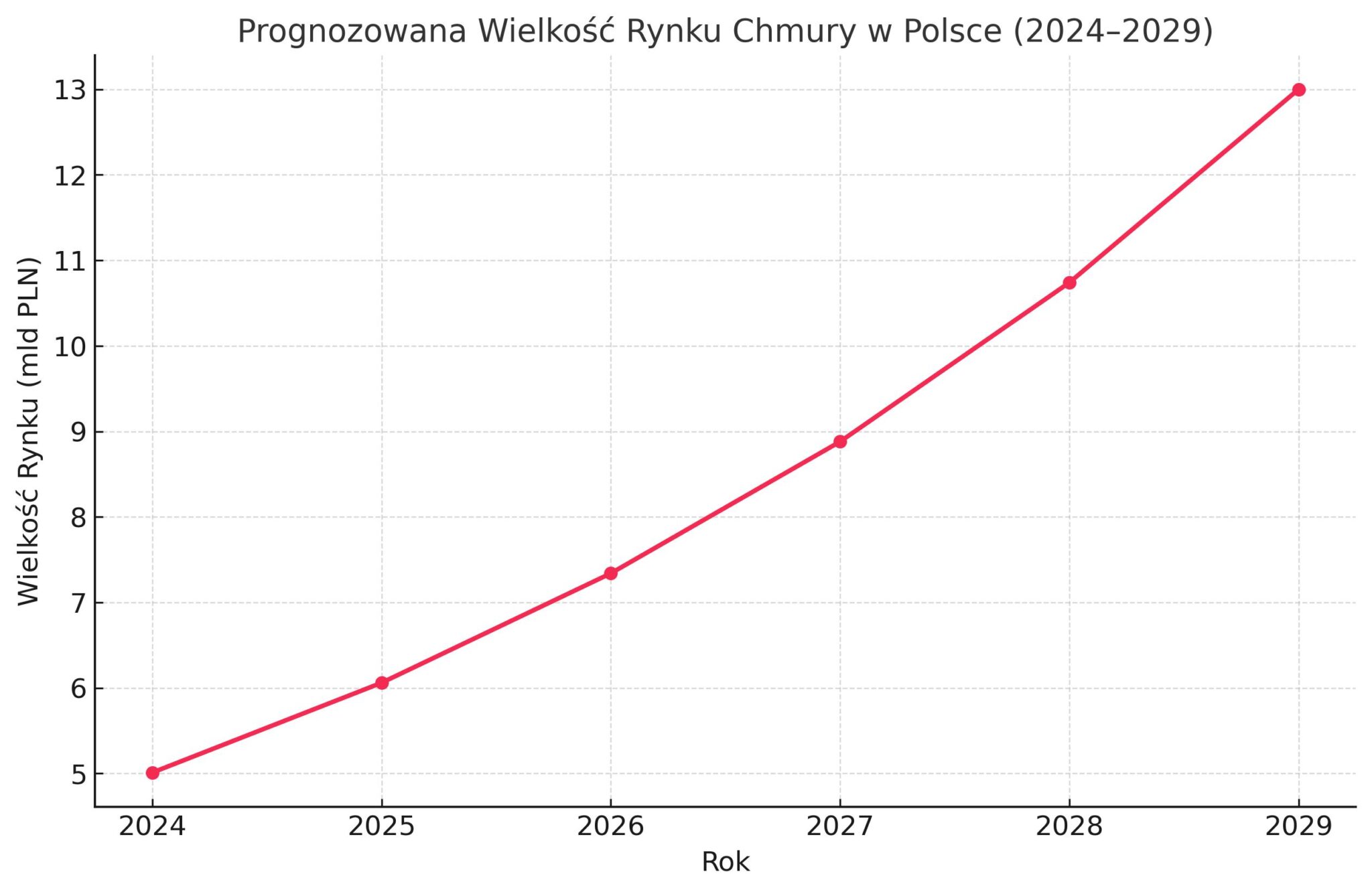 Polski rynek chmury obliczeniowej charakteryzuje się intensywnym wzrostem i znaczącymi prognozami na przyszłość. W 2023 roku osiągnął wartość 3,9 miliarda PLN, a przewiduje się, że do 2029 roku wzrośnie do 13 miliardów PLN. Średnioroczny wzrost w tym okresie szacowany jest na 22%. Tempo wzrostu rynku usług chmurowych znacznie przewyższa tempo wzrostu całego rynku IT , chociaż nadal stanowi on stosunkowo niewielką część całkowitych wydatków na IT (poniżej 10% w 2023 roku). PMR prognozuje, że ten udział będzie systematycznie wzrastał w nadchodzących latach. Polska umacnia swoją pozycję lidera w adopcji chmury w regionie Europy Środkowo-Wschodniej , co potwierdza rosnące wykorzystanie chmury przez przedsiębiorstwa w kraju.