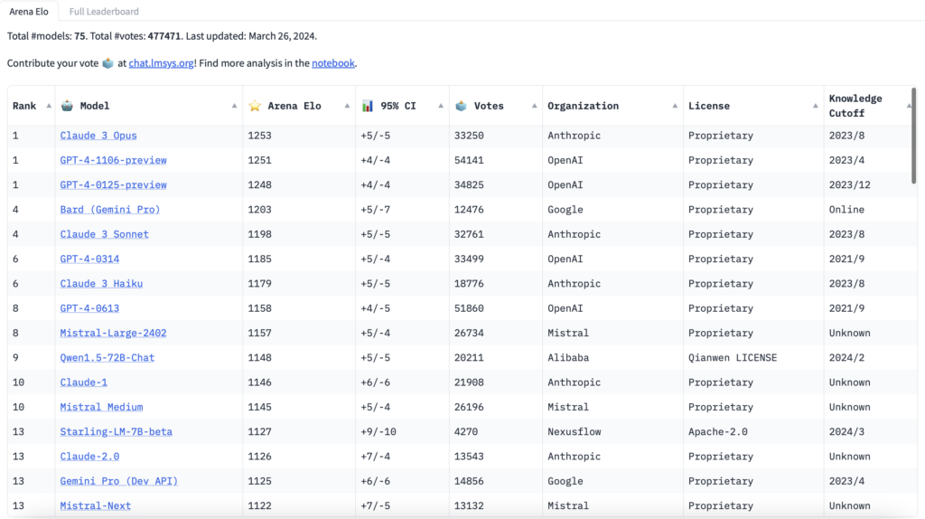 Od swojego wprowadzenia wiosną 2023 roku, GPT-4 utrzymywał pozycję lidera w dziedzinie językowych modeli AI, zdobywając uznanie zarówno wśród badaczy, jak i użytkowników końcowych za swoją zdolność do generowania przekonujących, spójnych i często zaskakująco trafnych odpowiedzi. Jednakże, od 26 marca, na LLM Chatbot Arena widnieje nowe nazwisko na szczycie rankingu: Claude 3 Opus. Ten flagowy model Anthropic, zaprezentowany w marcu, od razu zrobił duże wrażenie, przedstawiając benchmarki sugerujące, że przewyższa on GPT-4 oraz inne konkurencyjne modele, takie jak Google Gemini.