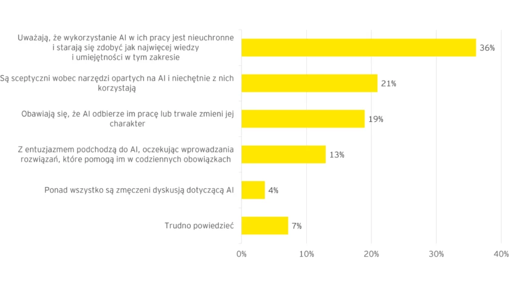 Z najnowszego badania EY “Jak polskie firmy wdrażają AI” wynika, że organizacje w Polsce coraz chętniej sięgają po sztuczną inteligencję do automatyzacji powtarzalnych zadań. Równocześnie rosnące wdrożenia budzą wśród pracowników różne reakcje – od entuzjazmu i gotowości do nauki po obawy o utratę pracy.