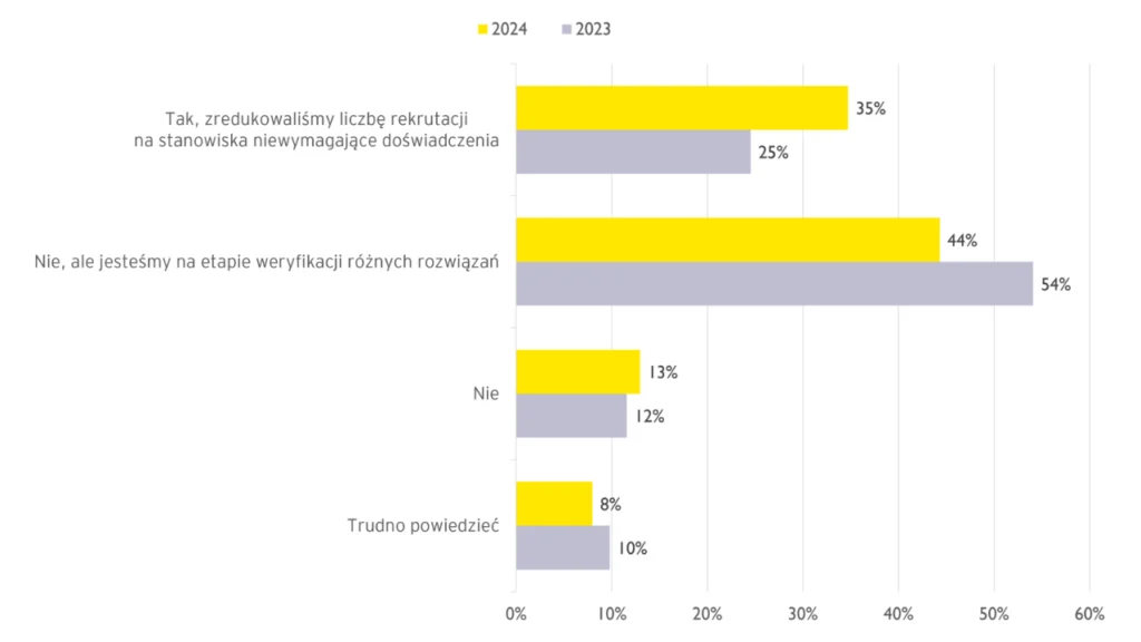 36% przedsiębiorstw odnotowuje wśród swoich pracowników świadomość nieuchronności AI i konieczności podnoszenia kompetencji cyfrowych. Z drugiej strony 21% firm wskazuje na sceptycyzm, a 19% na obawy o stabilność zatrudnienia. Firmy coraz częściej ograniczają rekrutacje na stanowiska niewymagające doświadczenia – już 35% organizacji podjęło decyzję o redukcji takich naborów, co oznacza wzrost o 10 punktów procentowych rok do roku. Może to prowadzić do powstania luki kompetencyjnej, która w przyszłości wpłynie na zdolność firm do skutecznego zarządzania kadrami.