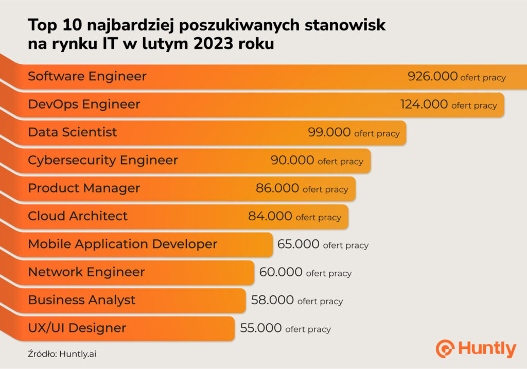 Huntly stworzyła swój „Ranking najbardziej poszukiwanych stanowisk IT” analizując liczbę ofert pracy w takich serwisach, jak Glassdoor, Indeed, LinkedIn i Dice. Należą one do najczęściej wykorzystywanych przez amerykańskie i zachodnioeuropejskie firmy technologiczne w działaniach rekrutacyjnych. Oprócz stanowisk Software Engineer, DevOps Engineer i Data Scientist, do innych obecniej najbardziej poszukiwanych specjalistów IT należą: Cybersecurity Engineer, Product Manager, Cloud Architect, Mobile Application Developer, Network Engineer, Business Analysts, a także UX/UI Designer.