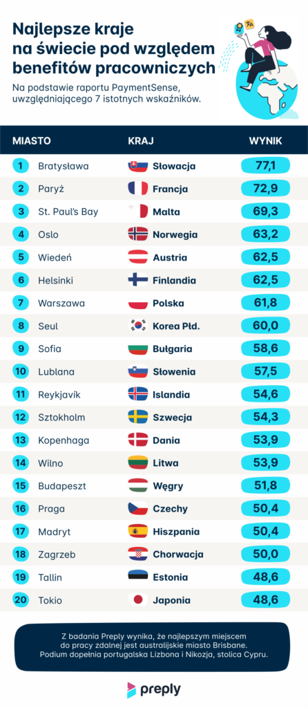 Według danych Remote najlepiej pod kątem benefitów pracowniczych w Europie wypadają kolejno Luksemburg, Hiszpania i Norwegia, a zaraz za podium plasują się Niemcy, Francja i Polska. Wiele bonusów, które cieszą się popularnością w krajach Europy Zachodniej i Północnej, na naszym rynku pracy jest rzadkością. Przykładowo Francuzi mocno cenią dopłaty do zdrowych posiłków i wsparcie zdrowia psychicznego, a Islandczycy – 4-dniowy tydzień pracy.
