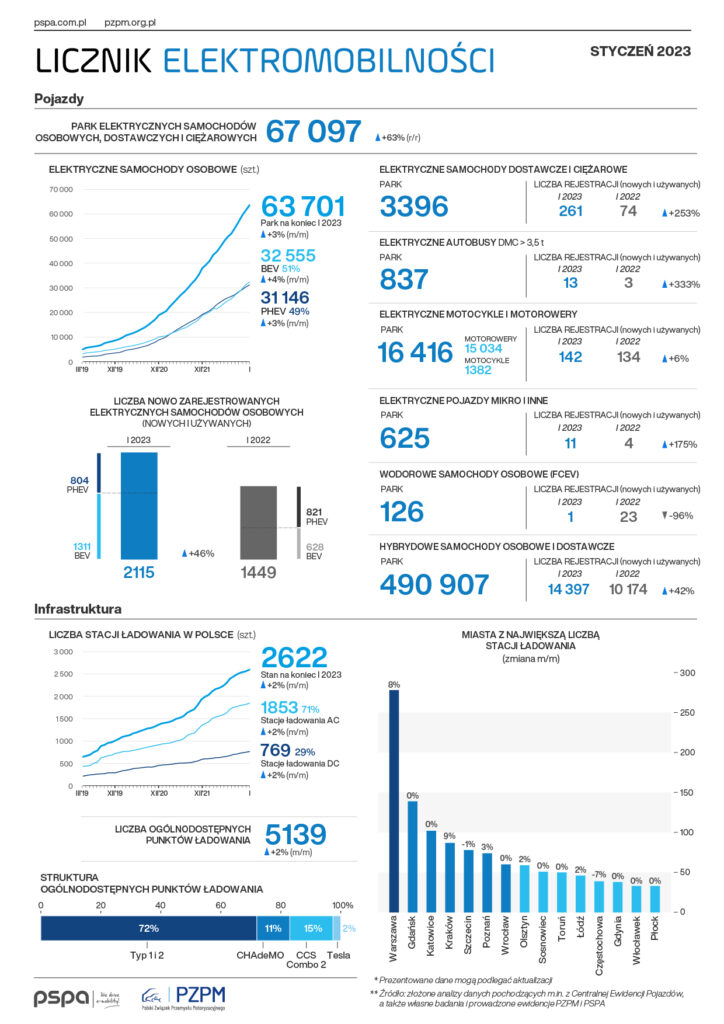Pod koniec stycznia 2023 r. po polskich drogach jeździło 63 701 elektrycznych samochodów osobowych. W pełni elektryczne auta (BEV, ang. battery electric vehicles) odpowiadały za 32 555 szt. tej części floty pojazdów (51%), a pozostałą część stanowiły hybrydy typu plug-in (PHEV, ang. plug-in hybrid electric vehicles) – 31 146 szt. (49%). Park elektrycznych samochodów dostawczych i ciężarowych liczył 3 396 szt. W dalszym ciągu rośnie też flota elektrycznych motorowerów i motocykli, która na koniec stycznia składała się z 16 416 szt., jak również liczba osobowych i dostawczych aut hybrydowych, która powiększyła się do 490 907 szt. Pod koniec ubiegłego miesiąca park autobusów elektrycznych w Polsce wzrósł do 837 szt.