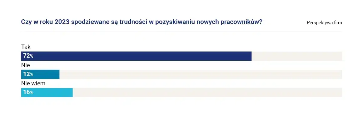 W aktualnym otoczeniu makroekonomicznym, dla kandydatów zmiana pracy niesie za sobą większe ryzyko. Na udział w rekrutacjach oraz przyjęcie oferty będą decydować się z większą ostrożnością, uważnie analizując, czy nowa firma zaoferuje im stabilne zatrudnienie. Taka postawa dodatkowo utrudni pracodawcom rekrutacje. Potwierdzają to wyniki badania Hays – w roku 2023 aż 72 proc. firm spodziewa się wyzwań w pozyskiwaniu pracowników. Stanowi to wynik niższy od ubiegłorocznego o zaledwie 2 pkt. proc.