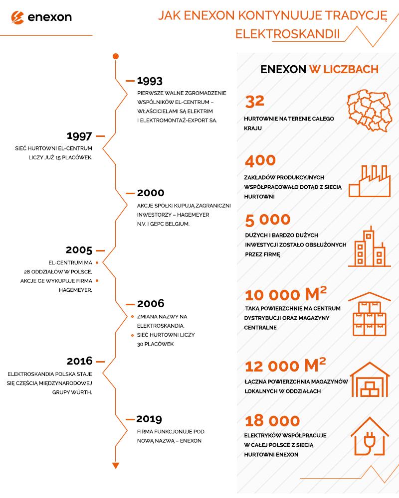 Sieć hurtowni znanych przez lata jako Elektroskandia Polska w ubiegłym roku obchodziła 25-lecie istnienia. W tym czasie dynamicznie się rozwijała, zyskując zaufanie klientów. Początek działalności firmy jeszcze pod nazwą El-Centrum datuje się na listopad 1993 roku. Rok później firma mogła pochwalić się już pięcioma oddziałami, zaś w 1997 roku było ich aż 15. Tę liczbę podwojono do roku 2006, kiedy to też podjęto decyzję o zmianie nazwy na Elektroskandia Polska. Przez kilkanaście lat była częścią takich koncernów, jak: Elektrim, Elektromonaż-Export, Hagemayer, GEPC Belgium czy Rexel.